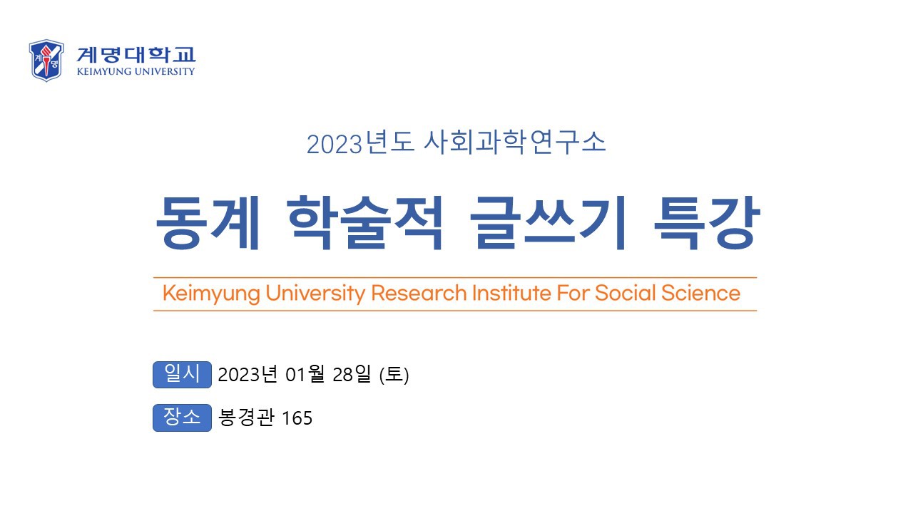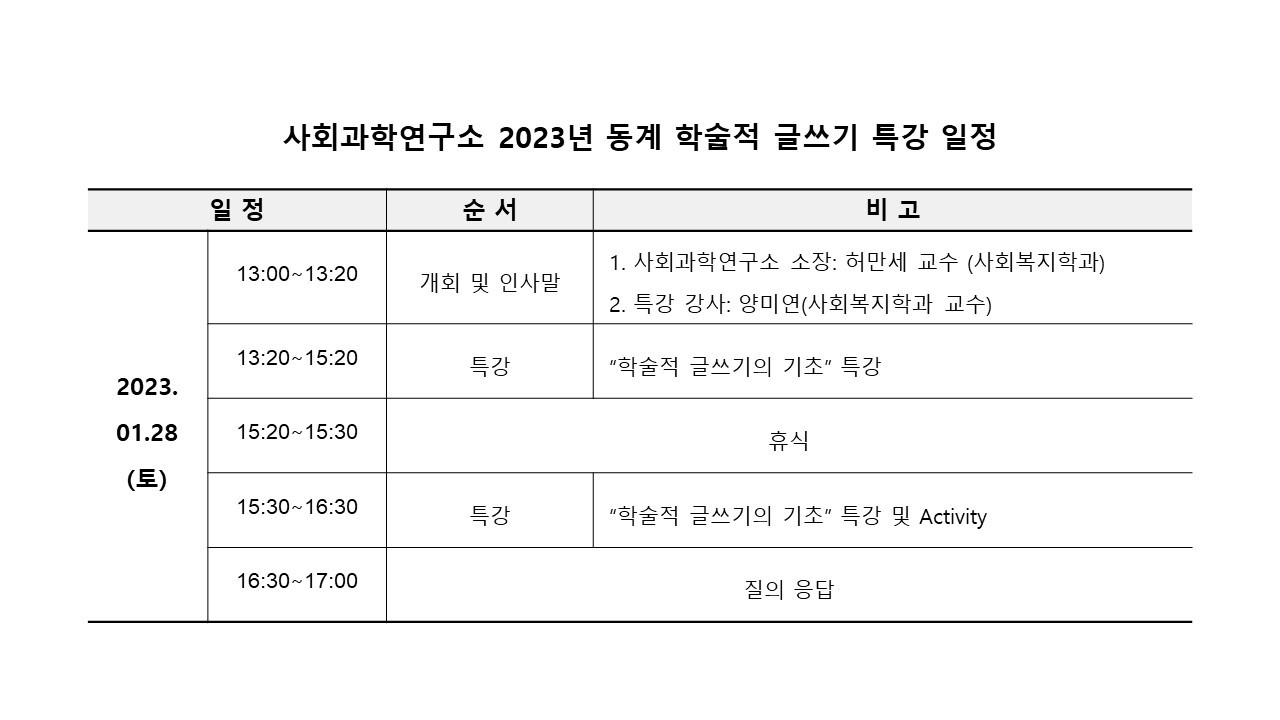 2023년 사회과학연구소 동계 학술적 글쓰기 특강 및 기초통계특강을 다음과 같이 개최하고자 합니다.